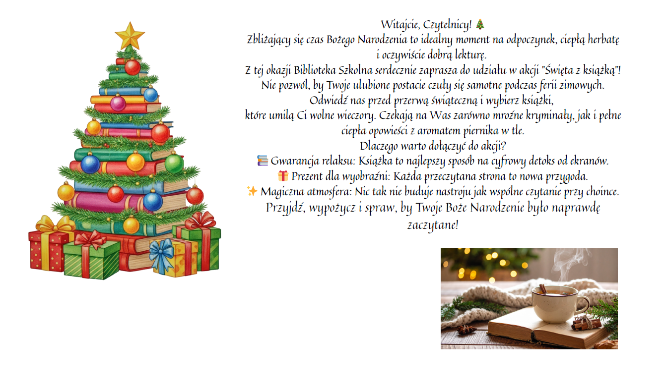 Z tej okazji Biblioteka Szkolna serdecznie zaprasza do udziału w akcji „Święta z książką”!