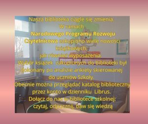 W roku szkolnym 2020 /21 nasza biblioteka uczestniczy w NARODOWYM PROGRAMIE ROZWOJU CZYTELNICTWA. Z pozyskanych z w/w Programu pieniędzy zakupiono wiele nowości wydawniczych. Zakupu dokonano po licznych konsultacjach z nauczycielami, rodzicami a przede wszystkim uczniami.